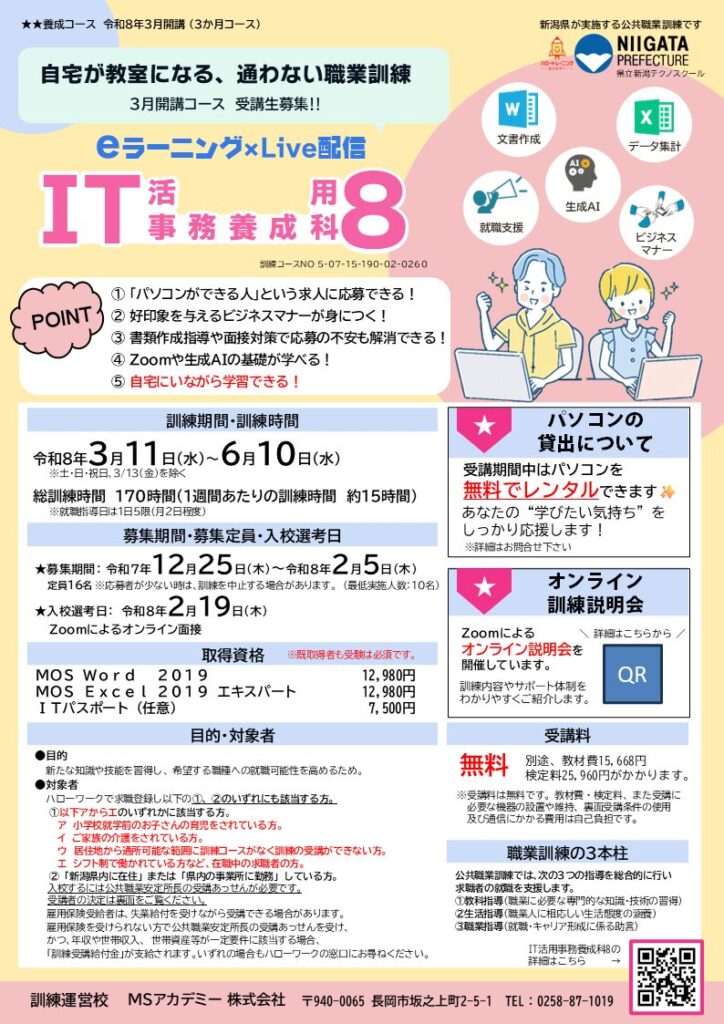 | 応募書類 | (1)入校申込書(ハローワークにあります) 撮影6か月以内の顔写真(35mm×45mm 以内)を貼付してください。 (2)返信用封筒(合否結果通知用) 長3型(120㎜×235mm)の表面に郵便番号、住所および氏名を記入し、110円切手を貼付してください。 (3)入校申込のメール連絡 ハローワークで申込を行った後、リーフレットに記載されている新潟テクノスクール代表アドレスにメールを送信してください。なお、メールの件名は「IT活用事務養成科3入校申込」とし、メールの本文には ①氏名、②申込日、③入校申込を行ったハローワークの名称、④連絡可能なメールアドレスを記載してください。後日、面接選考における時間やZoomのID等、いただいたメールアドレス宛に送信いたします。 |